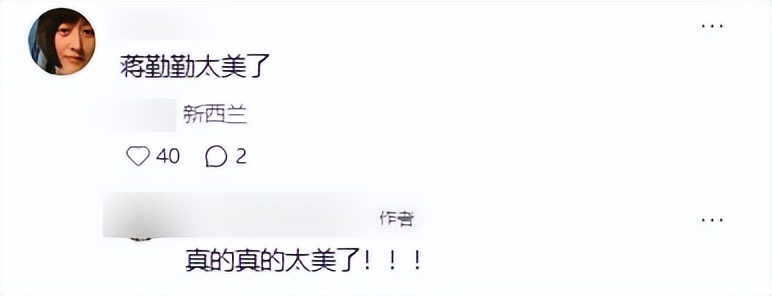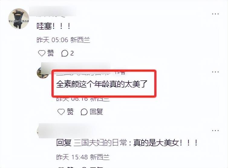 这对夫妻的奥克兰偶遇画面被分享到网络后,网友留言说“蒋勤勤这状态哪里像50岁,说30岁我都信,素颜也太能打了”。