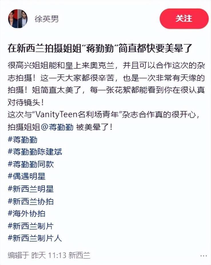 蒋勤勤和陈建斌此次现身奥克兰并非单纯旅游,而是工作与享受二人世界兼顾。蒋勤勤还完成了某杂志的封面拍摄工作,这也是她此次前往奥克兰的重要缘由。